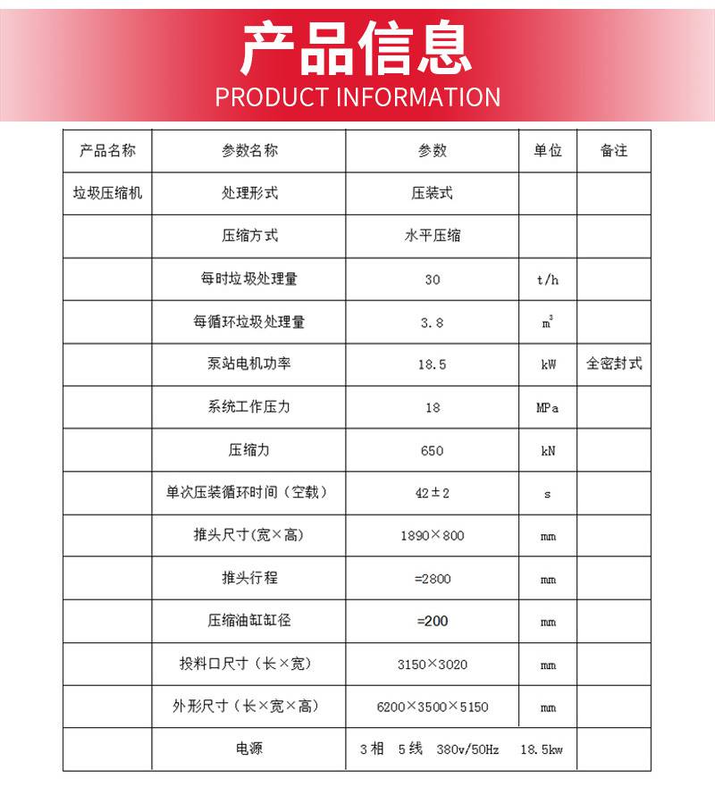 垃圾压缩中转设备环保性好,水平垃圾压缩机从进料到压缩过程都在设备内密闭的环境中完成,其他形式垃圾压缩机无论进料还是压缩过程,垃圾大部分会暴露在外,从而垃圾臭气难以控制。
